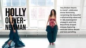 “Any Broken Hearts to Mend” is an eveningwear collection with a focus on embracing the divine feminine. Delving into the history of 1920s show girls I draw on themes of empowerment, sex positivity and exploring the history of the flapper; designing garments that feel sensual on the body, fill the wearer with confidence, and channel the captivating energy of a liberated performer of the 20s.